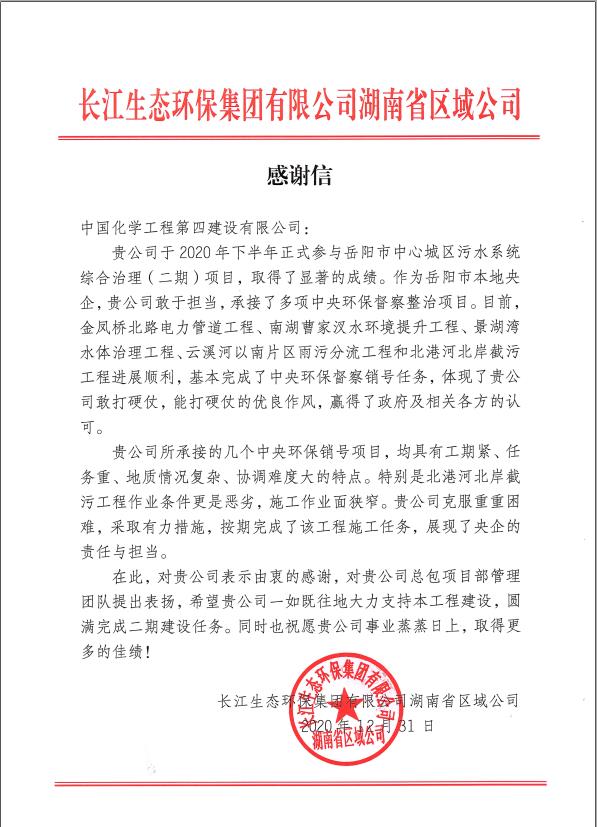 長江生態環保集團(湖南省區域公司)的感謝信是項目部新年伊始收到的一份厚實的禮物,對項目部2021年起好頭、開好步,有著巨大的鼓勵和促進作用。這個好消息無疑讓元旦佳節還堅守在施工一線的全體人員為之欣慰和振奮。大家表示,一定繼續堅持“生態優先、綠色發展”的理念,在共抓長江大保護中發揮骨干主力作用,在風雷激蕩中挺立潮頭、在勇毅篤行中揚帆遠航,順利完成施工任務。 (通訊員  陳誠)