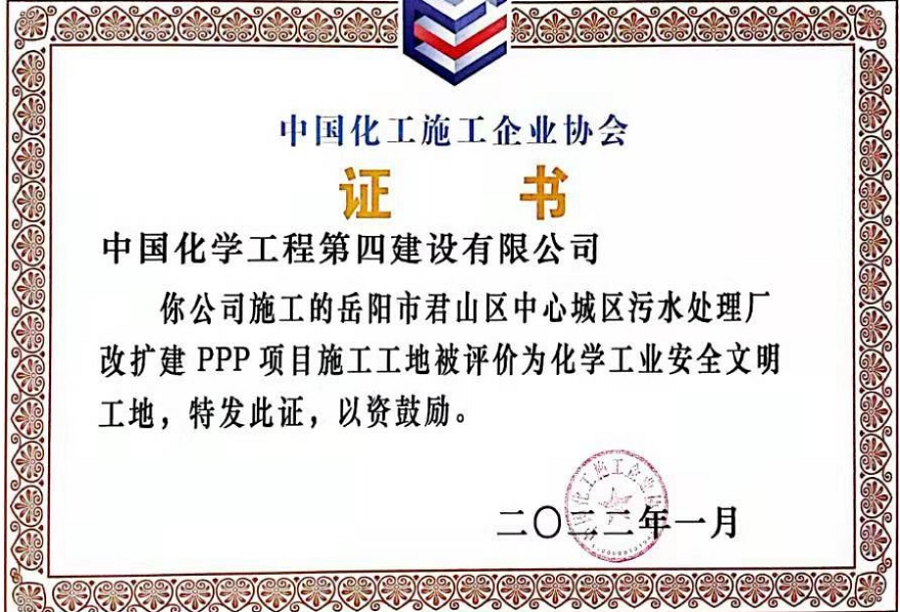 近日,從中國(guó)化工施工企業(yè)協(xié)會(huì)傳來(lái)喜訊,由市政工程公司承建的岳陽(yáng)市君山區(qū)中心城區(qū)污水處理廠改擴(kuò)建PPP項(xiàng)目被評(píng)為“化學(xué)工業(yè)安全文明工地”稱號(hào)。