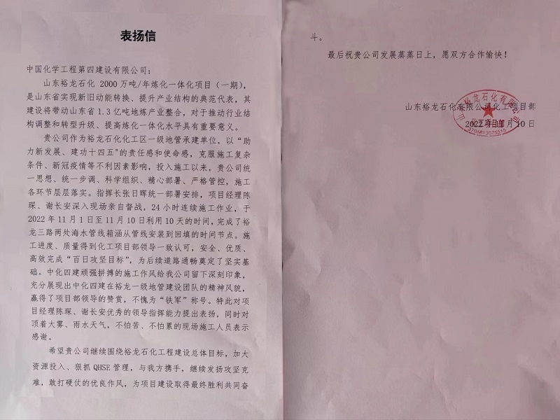 表揚信中對項目部的施工進度、質量和頑強拼搏的作風給予了充分肯定。信中指出,項目部自投入施工以來,科學組織、精心部署、嚴格管控,施工各環節層層落實。特別是11月1日至11月10日利用10天時間,完成了裕龍三路兩處海水管線箱涵從管線安裝到回填的時間節點,安全、優質、高效完成了項目“百日攻堅目標”,展現了四化建公司良好的團隊精神風貌,不愧為“鐵軍”稱號。